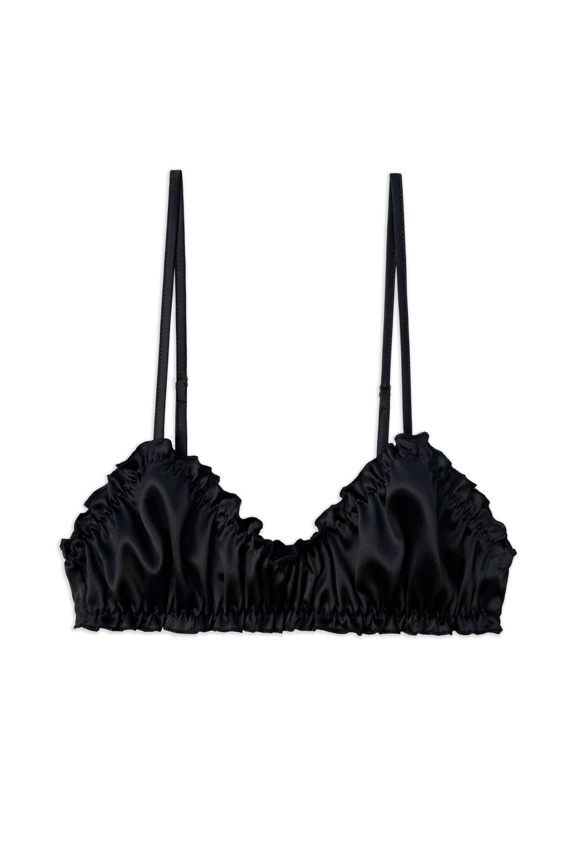 The satin silk frilled bra features delicate lettuce edge hems and thin adjustable silk straps. This bra will feel soft and comfortable when worn and offers light support. Handmade with Italian premium silk, its timeless look makes it ideal both for everyday wear and for events to remember.
