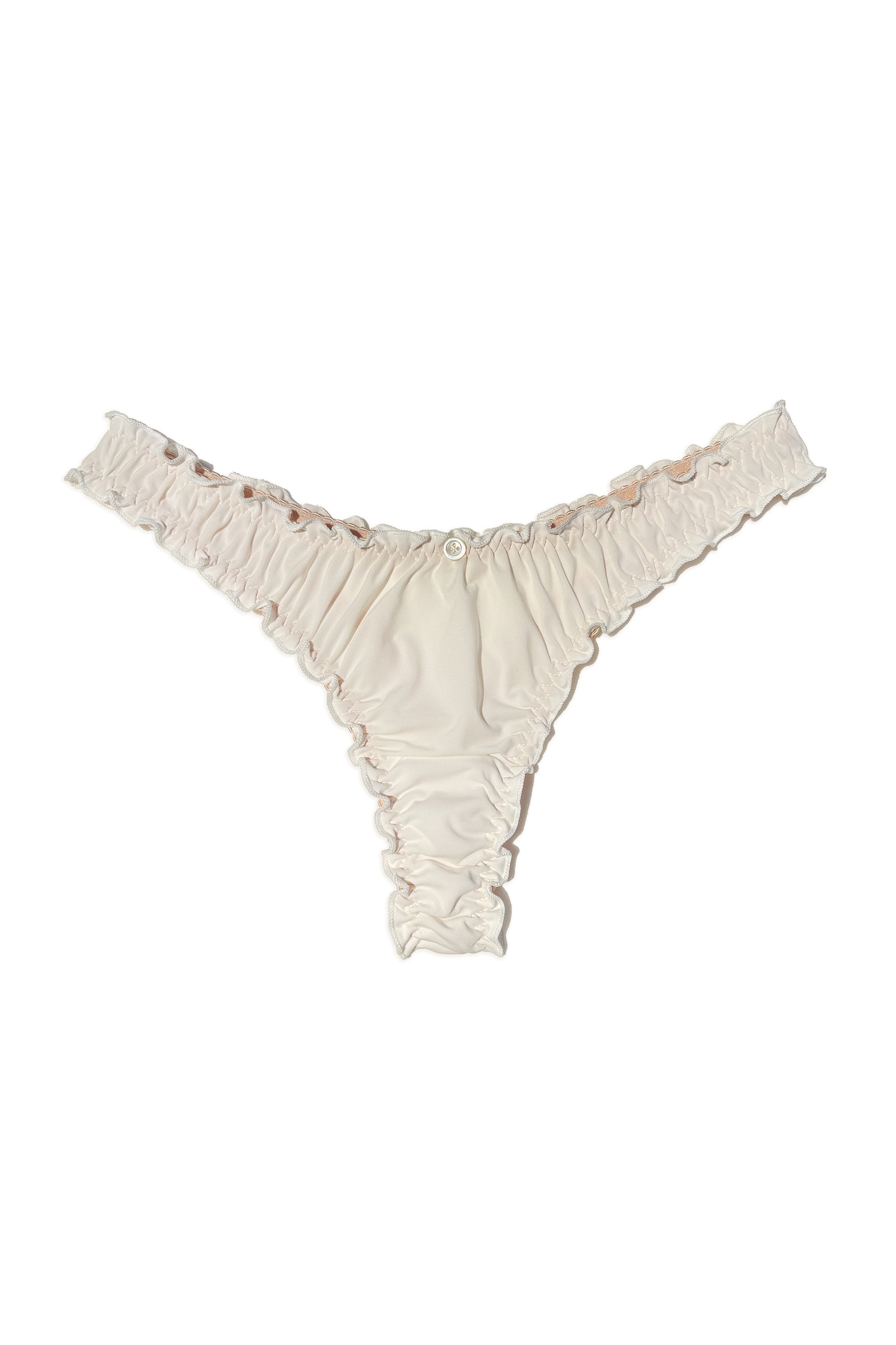 The mid-rise, high-leg lycra frilled thong features delicate lettuce edge hems and combines comfort with a timeless, dreamy look. Handmade from Italian buttery soft lycra fabric, this thong will feel like a gentle caress when worn, and it's ideal both for everyday wear and for events to remember.